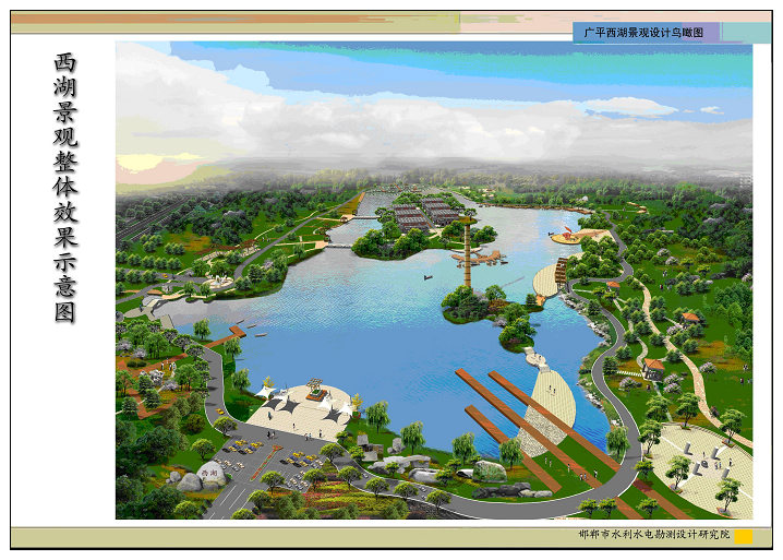廣平縣環(huán)城水系規(guī)劃 按照省委、省政府提出的“三年大變樣、三年上水平、三年出品位”的原則,立足“高站位、大手筆、大氣魄”,圍繞建設(shè)“秀美鵝城、清宜廣平”的目標(biāo),在充分分析廣平縣現(xiàn)有水系和城市規(guī)劃的基礎(chǔ)上,圍繞環(huán)城水系建設(shè),新建人工湖泊,修建引蓄水工程,打造環(huán)城水系沿線濱水景觀。受廣平縣水利局委托,我院完成了本次廣平縣環(huán)城水系規(guī)劃。