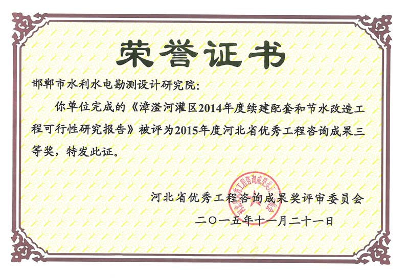 2015年度河北省優(yōu)秀工程咨詢成果三等獎